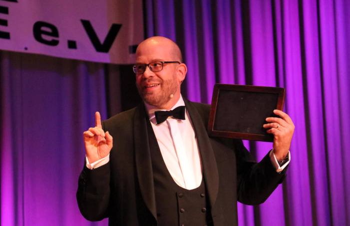 der Stuttgarter Zauberkünstler dem Publikum im Münchinger Widdumhof